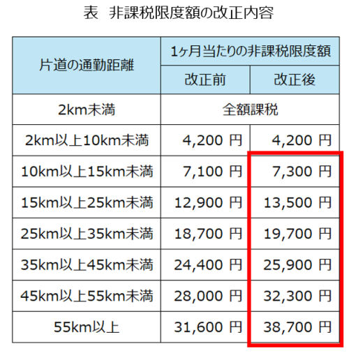 該当する従業員に支給する通勤手当については、距離区分ごとに非課税となる上限額が見直されています。